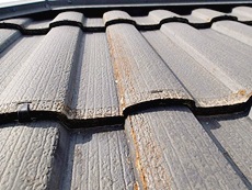 | 施工前の様子です。築18年のお家で塗膜の劣化が全体的にうかがえました。 | 塗膜が劣化し、屋根全体が白くなってしまっていました。 | 瓦に近づいてみると塗膜がはげてしまっているのがわかります。 |