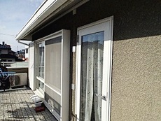 | バルコニーの様子です。スタッコ仕上げの凸凹の大きな外壁だったので、塗り替えの際はローラーで丁寧に塗り替えをすることをご提案しました。 | 軒天も大きな損傷はなかったものの全体的に塗膜の劣化がうかがえたので塗り替えていきます。 | 戸袋と雨戸も汚れが目立っていたので計14枚全て塗り替えていきます。 |
