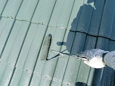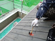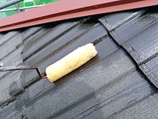| 雪止め・棟押え板金といった金属部の錆止めを行っていきます。 | 浸透性シーラー塗布(2液型)で屋根の下塗りを行います。 | フッ素樹脂塗料塗布(弱溶剤系)での屋根中塗りの様子です。 |