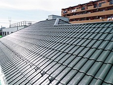 | 施工完了です。外壁屋根を全面塗り替えし、色は屋根、外壁共にモスグリーン系で仕上げました。 | 屋根はセキスイU瓦屋根となっており、特に密着性を考慮して浸透性シーラーは2液型、中・上塗りはモスグリーンの弱溶剤コロニアル屋根用フッ素樹脂塗料で仕上げました。 |