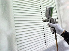 | 中塗りが完了しました。 | 中塗りの後、フッ素樹脂塗料塗布で上塗りを行います。色はモスグリーンで仕上げました。 | 雨戸や戸袋は、吹き付けによる塗装を行います。 |