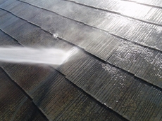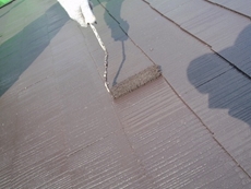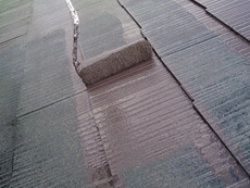 | 施工後です。今回は激しい劣化はありませんでしたが、全般的な剥離と吸い込みがあっため、全面2度塗りとしました。 | 屋根は洗浄の後の十分な乾燥が必要なので、下塗りのプライマーを塗るまでが最もお天気に左右され易い工程です。 |