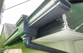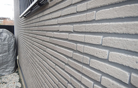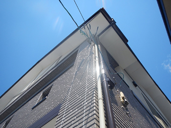 | 化粧幕板、軒樋・縦樋の塗膜剥がれ・褪色が見られます。 | サイディング板目地はシールの硬化・剥離・チョーキングが進行しています。 | サイディングのチョーキングはまだ発生せず、まだ光沢を保っています。 |