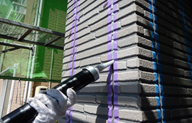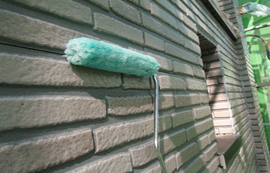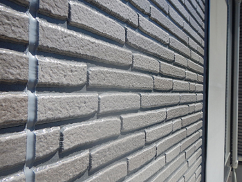| 硬化・剥離が進んだサイディング板目地・サッシまわりシールは全面的に打ち替えします。 | まだチョーキングの進んでいないサイディングには耐候性のあるクリアー塗料(UVプロテクトクリアー)を2回塗布します。 |
