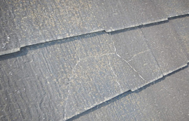| 築10年目ですが、コロニアル屋根、サイディング板目地シールの劣化が顕著です。 | コロニアル屋根には各所にひび割れが見られました。 | コロニアルは劣化のため脆くなっており、体重を乗せると簡単に割れてしまいます。 |