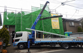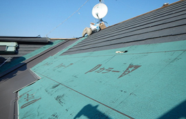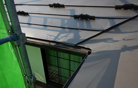 | 長尺物の板金とアスファルトルーフィングを荷揚げし、全て屋根に固定して作業を進めます。 | カバー工法は防水性を確保するため、ルーフィングも板金も下から上方向に張り進みます。 | 軒先のケラバや鼻隠しを板金で被せて葺きます。 |